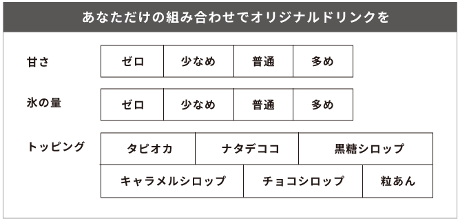 ドリンクは全てご注文を頂いてからお作りしています。甘さ・氷の量・トッピング[タピオカ・ナタデココ・黒糖シロップ・キャラメルシロップ・チョコシロップ・粒あん]からあなた好みにカスタマイズ可能です。